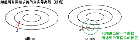 那online的优势在哪里呢?其关键是每走一步只需要看一下当前的一个数据,所以代价很小。而offline的算法每走一个要看下所有数据来算一 个真实梯度,所以代价很大。假定有100个数据,offline走10步就到最优,而online要100步才能到。但这样offline需要看1000 个数据,而online只要看100个数据,所以还是online代价小。